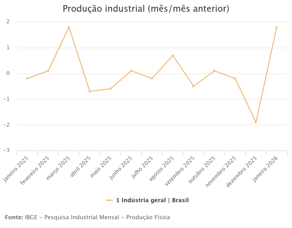 A produção industrial avançou 1,8% na passagem de dezembro de 2025 para janeiro de 2026, eliminando parte do recuo de 2,5% acumulado de setembro a dezembro de 2025. Este foi o crescimento mais intenso desde junho de 2024 (4,4%). Em relação a janeiro do ano anterior, a indústria avançou 0,2% e interrompeu três meses consecutivos de queda na produção: dezembro (-0,1%), novembro (-1,4%) e outubro de 2025 (-0,5%). A média móvel trimestral em janeiro foi de -0,1%. Com esses resultados, a produção industrial se encontra 1,8% acima do patamar pré-pandemia (fevereiro de 2020), mas ainda está 15,3% abaixo do nível recorde alcançado em maio de 2011. Os dados são da Pesquisa Industrial Mensal (PIM), divulgada hoje (6) pelo IBGE.