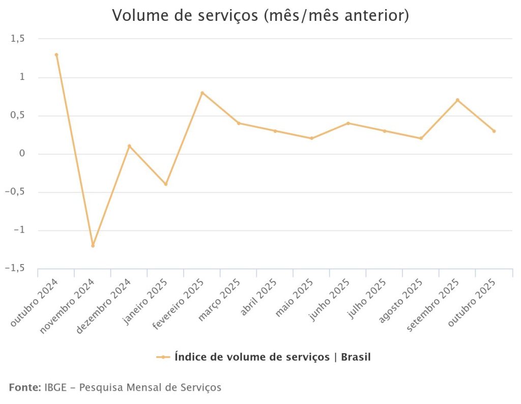 A maior parte (15) das 27 unidades da federação tiveram crescimento no volume de serviços em outubro de 2025, na comparação com setembro (com ajuste sazonal). Os impactos positivos mais expressivos vieram do Rio de Janeiro (2,0%) e do Paraná (2,5%), seguidos pelo Espírito Santo (4,6%), Mato Grosso do Sul (6,3%) e Santa Catarina (1,1%). Já São Paulo (-0,6%), Rio Grande do Sul (-2,9%) e Distrito Federal (-3,9%) exerceram as principais influências negativas, seguidos por Mato Grosso (-3,3%) e Minas Gerais (-0,4%).